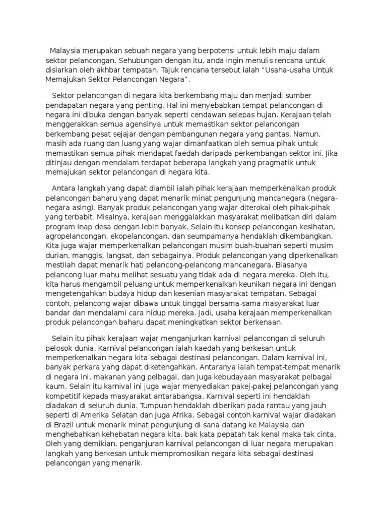 Panjang karangan anda hendaklah antara 200 hingga 250 patah perkataan. Di samping itu sektor pelancongan dapat memperkenalkan dan mengembangkan industri kraf tangan di Malaysia. Berkempen melalui media massa dan elektronik.